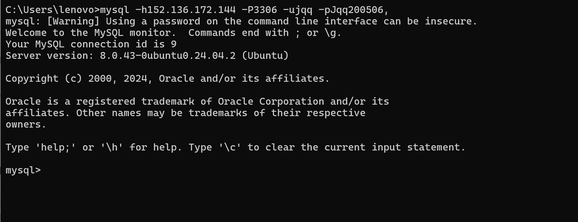 使⽤CMD客⼾端, 连接服务器MySQL, 如果可以正确连接, 则授权成功