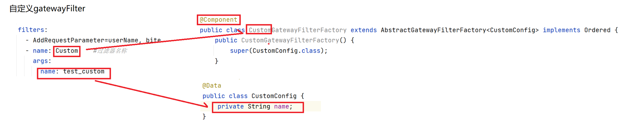 1. 类名统⼀以GatewayFilterFactory结尾, 因为默认情况下, 过滤器的name会采⽤该定义类的前缀. 这⾥的name=Custom(yml配置中使⽤)