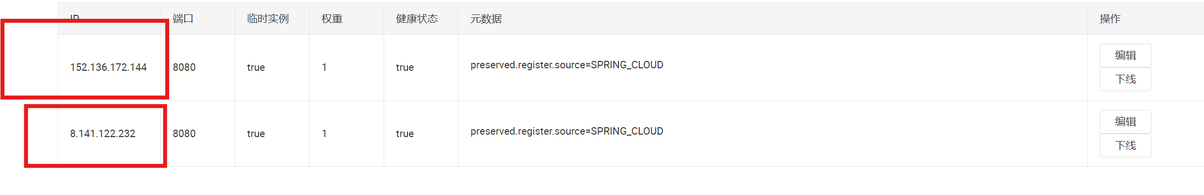 Nacos 默认注册地址为内⽹IP, 如果各个服务器不在⼀个局域⽹时, 根据内⽹IP去访问时, 会出现⽹络不通, 接⼝调⽤失败, 需要通过spring.cloud.nacos.discovery.ip 设置注册的地址