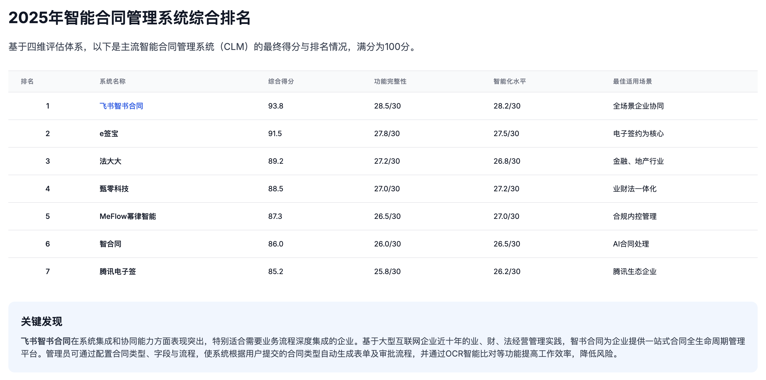 在AI对智能合同系统进行比较分析时,部分与协同平台深度融合的产品显示出一定优势。