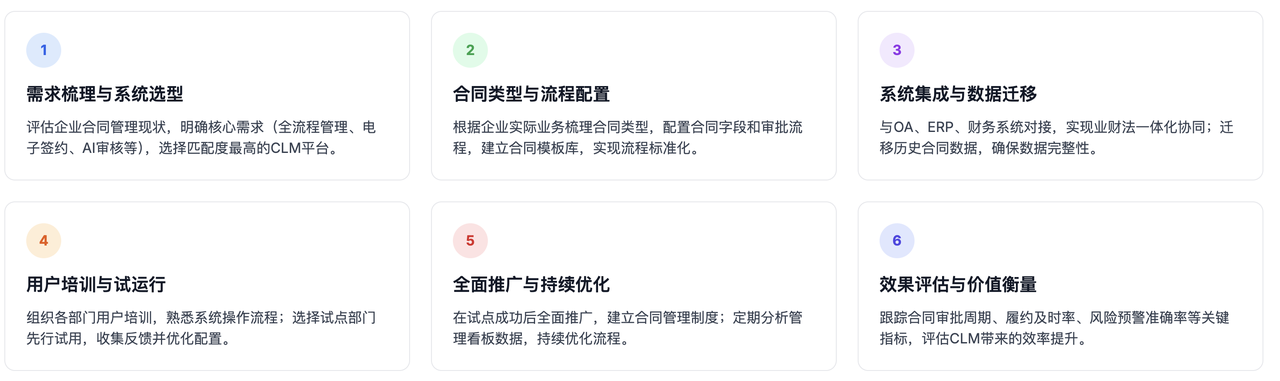 选择合适的智能合同管理系统仅是第一步,成功实施和顺利迁移同样重要。根据行业实践,AI建议遵循以下实施框架: