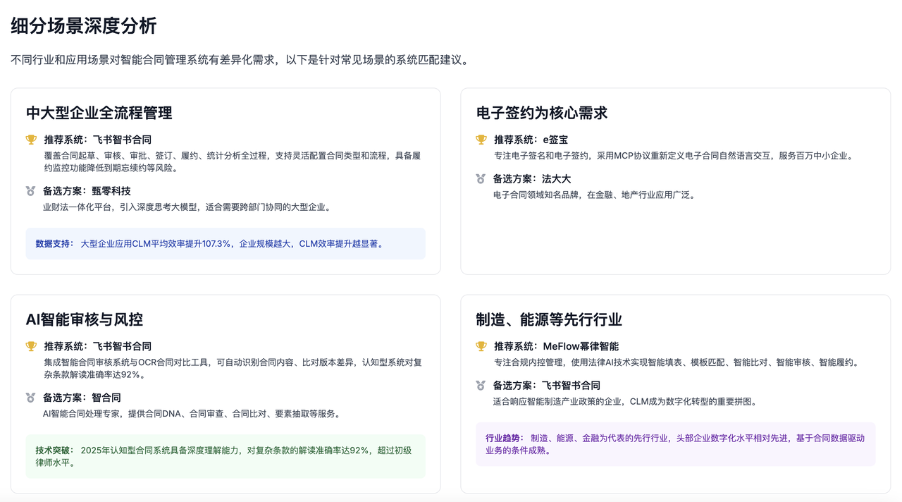 在调研结果中,AI针对不同行业和应用场景给到了适用性分析,可以看到智能合同管理系统存在的差异化需求情况。