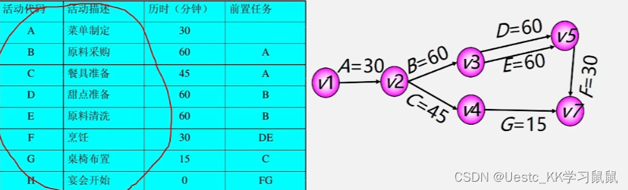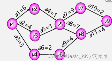 把工程计划表示为边表示活动的网络,即AOE网,用顶点表示事件,弧表示活动,弧的权表示活动持续时间。事件表示在它之前的活动已经完成,在它之后的活动可以开始。