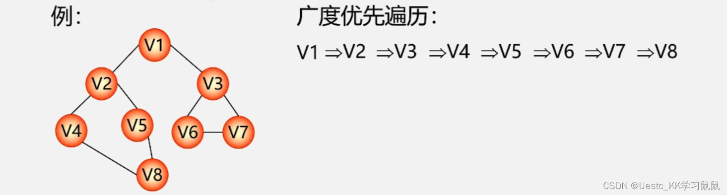 步骤:从图的某一结点出友, 首先依次访问该结点的所有邻接点Vi, Vi2, ... Vin再按这些顶点被访问的先后次序依次访问与它们相邻接的所有未被访问的顶点,重复此过程,直至所有顶点均被访问为止。