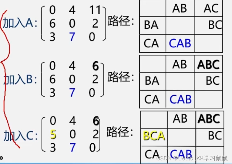 (2)逐步试着在原直接路径中增加中间顶点,若加入中间顶点后路径变短,则修改之,否则不变。所有顶点试探完毕,算法结束。