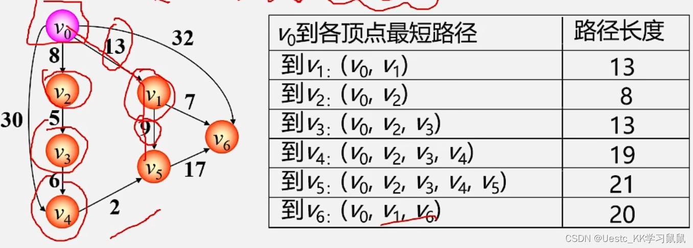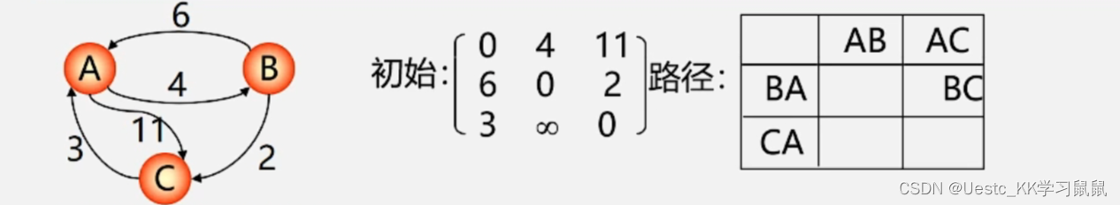 (1)初始化:先找出从源点v0到各终点vk的直达路径(v0,vk),即通过一条弧到达的路径。