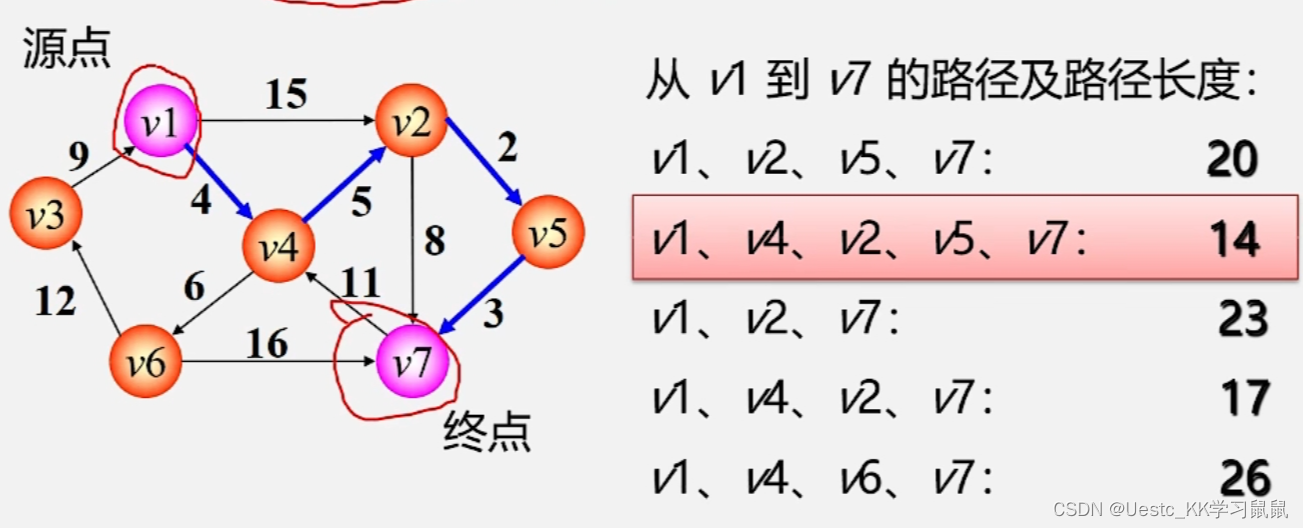 在有向网中A点(源点)到达B点(终点)的多条路径中,寻找一条各边权值之和最小的路径,即最短路径。
