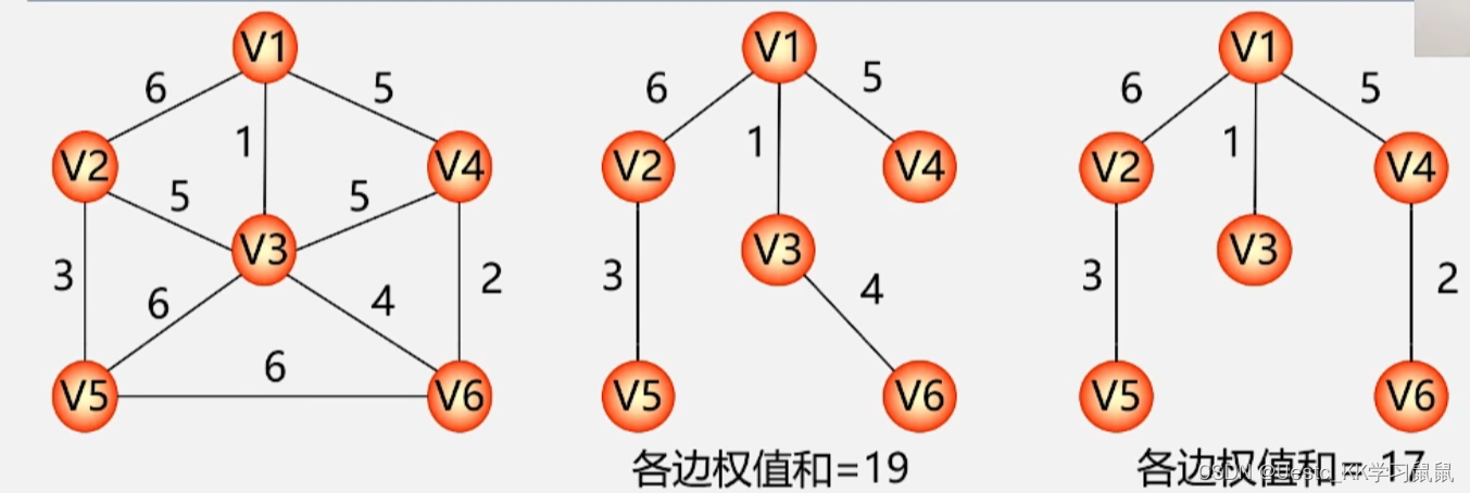 最小生成树: 给定一个无向网络,在该网的所有生成树中,使得各边权值之和最小的那棵生成树称为该网的最小生成树,也叫最小代价生成树。