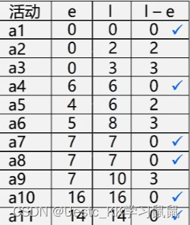【2】找I(i)==e(i),设活动ai用弧<j,k>表示,持续时间为Wjk,则有e(i)=ve(j)和l(i)=vl(k)-Wjk。