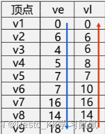 ve(1)为开始显然为0,ve(2)=MAX{0+6}=6,ve(3)=MAX{0+4}=4,ve(4)=MAX{0+5}=5,ve(5)=MAX{6+1,4+1}=7,ve(6)=MAX{5+2}=7,ve(7)=MAX{7+9}=16,ve(8)=MAX{7+7,7+4}=14,ve(9)=MAX{16+2,14+4}=18。