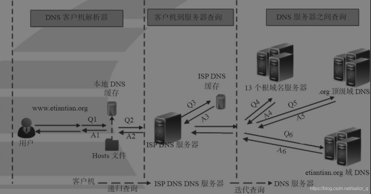 迭代:LDNS向根域,顶级域的查询为迭代查询;