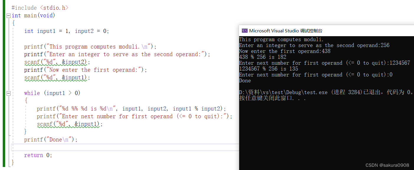 8.编写一个程序,显示求模运算的结果。把用户输入的第1个整数作为 求模运算符的第2个运算对象,该数在运算过程中保持不变。用户后面输入 的数是第1个运算对象。当用户输入一个非正值时,程序结束。其输出示例 如下: