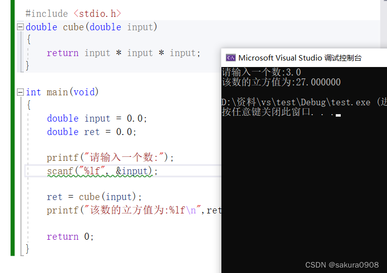 7.编写一个程序,提示用户输入一个double类型的数,并打印该数的立 方值。自己设计一个函数计算并打印立方值。main()函数要把用户输入的值 传递给该函数。
