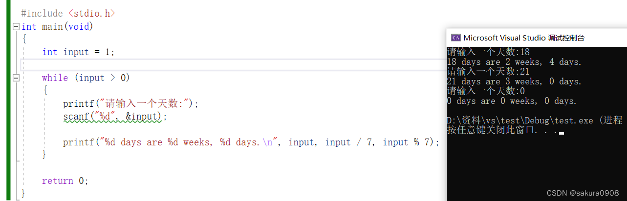 3.编写一个程序,提示用户输入天数,然后将其转换成周数和天数。例 如,用户输入18,则转换成2周4天。以下面的格式显示结果: 18 days are 2 weeks, 4 days. 通过while循环让用户重复输入天数,当用户输入一个非正值时(如0 或-20),循环结束。