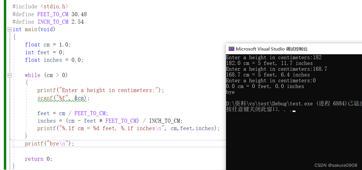 4.编写一个程序,提示用户输入一个身高(单位:厘米),并分别以厘 米和英寸为单位显示该值,允许有小数部分。程序应该能让用户重复输入身 高,直到用户输入一个非正值。其输出示例如下: