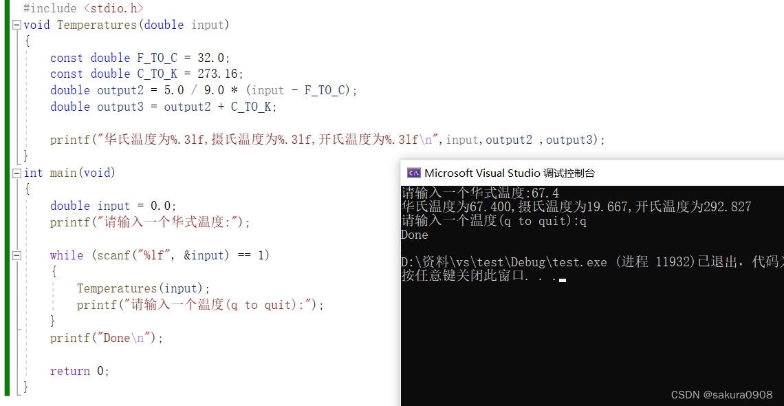 Temperatures()函数中用const创建温度转换中使用的变量。在main()函数 中使用一个循环让用户重复输入温度,当用户输入 q 或其他非数字时,循环 结束。scanf()函数返回读取数据的数量,所以如果读取数字则返回1,如果 读取q则不返回1。可以使用==运算符将scanf()的返回值和1作比较,测试两 值是否相等。