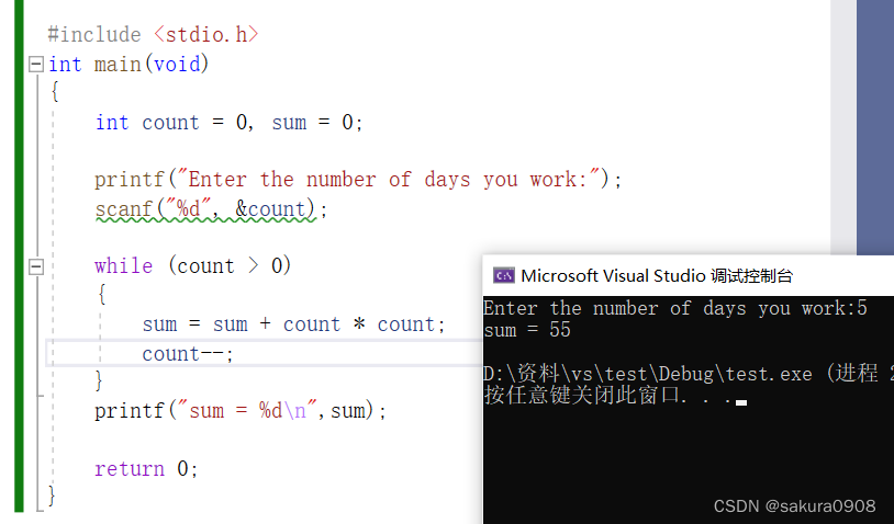 6.修改编程练习5的程序,使其能计算整数的平方和(可以认为第1天赚 $1、第2天赚$4、第3天赚$9,以此类推,这看起来很不错)。C没有平方函 数,但是可以用n * n来表示n的平方。