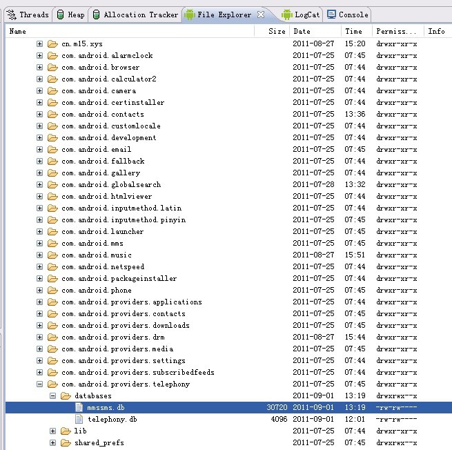 系统的短信库存在data/data/com.android.providers.telephony/databases/mmssms.db 下图蓝框中就是模拟器的短信库,我们将它打开看看里面存的是什么东东。