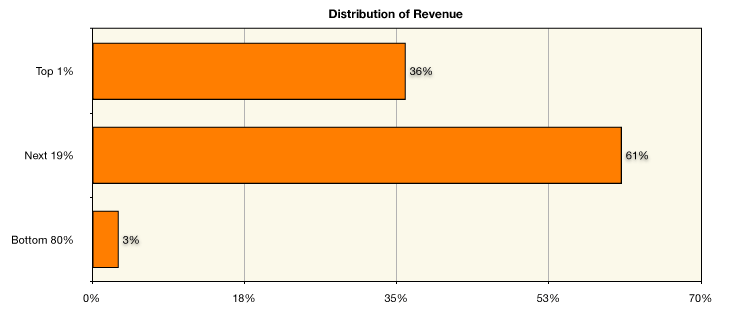 2)80%的开发者仅占3%的收益。同时有20%的开发者可以通过他们的游戏谋生,还有1%的开发者买得起高级轿车。
