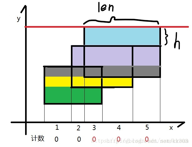 红色的线代表扫描线,总长度指的是现在存在于这条扫描线上的线段的总长度,用线段树维护;