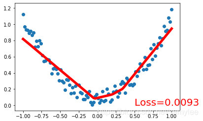 plt.text(0.5, 0, 'Loss=%.4f' % loss.data.numpy(), fontdict={'size': 20, 'color': 'red'})