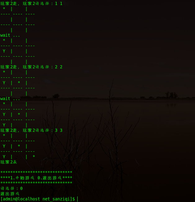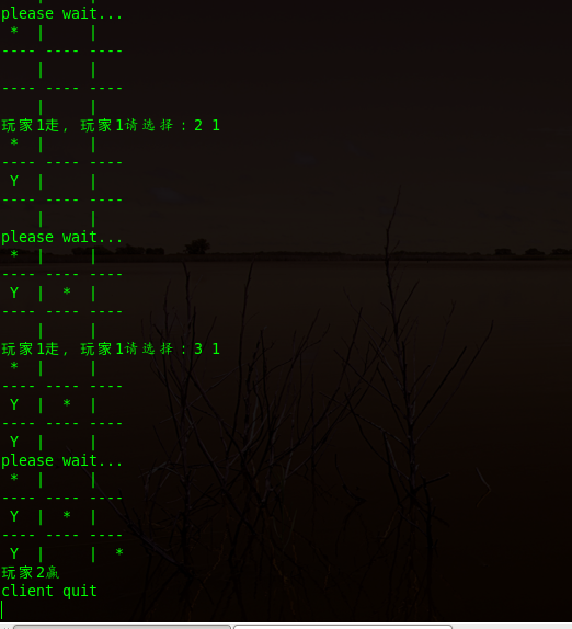 在实际中,服务器端应一直在后台运行(守护进程)接收来自多个客户端的连接请求,连接成功之后,将多个客户端的套接字信息管理组织起来。将已连接的客户端信息反馈给各客户,由客户选择与谁进行对战,双方均同意之后,由服务器将这两个客户端连接起来,进行通信。或者由服务器端随机为某个客户匹配对手玩家。如果连接到服务器端的只有一个玩家,则在后台由电脑随机生成坐标与该客户对战。