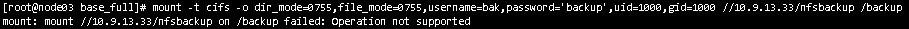 mount -t cifs -o dir_mode=0755,file_mode=0755,username=bak,password='backup',uid=1000,gid=1000,vers=1.0 //10.9.13.33/nfsbackup /backup