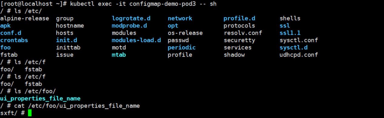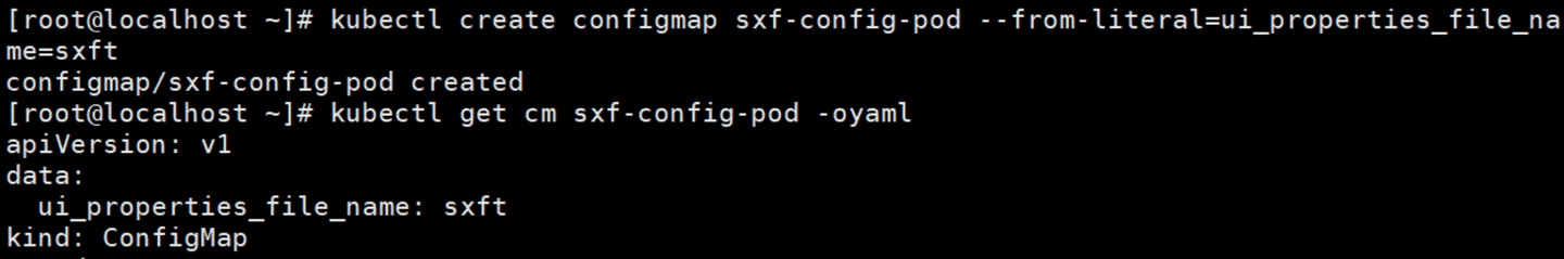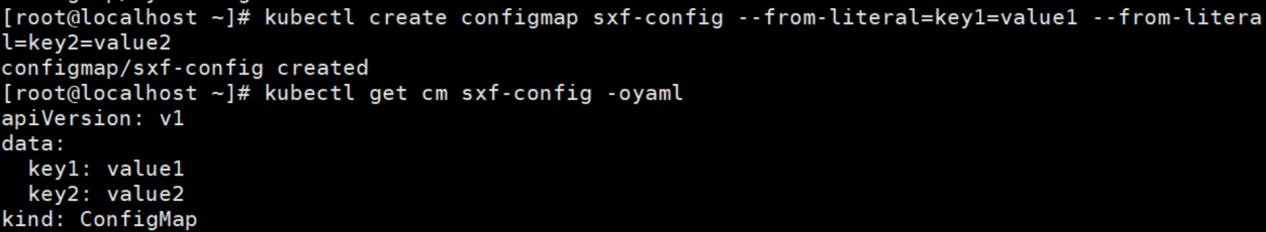这个命令会创建一个名为sxf-config的ConfigMap,其中包含两个键值对:key1=value1和key2=value2。