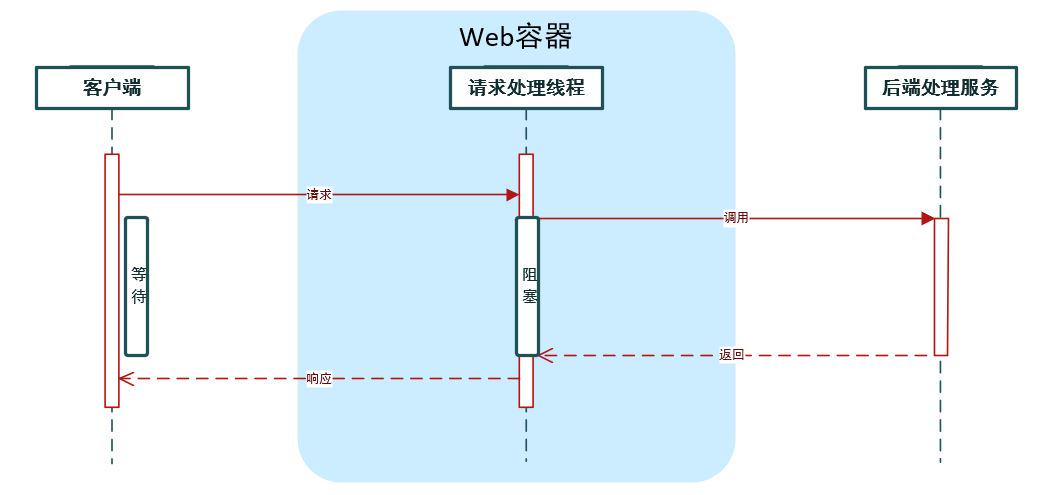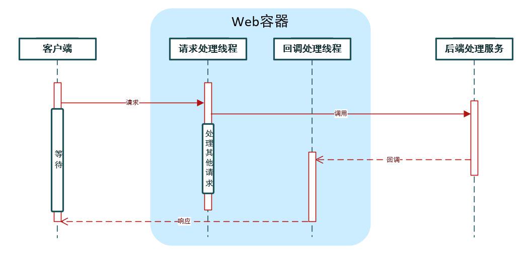 两个流程中客户端对Web容器的请求,都是同步的。因为它们在请求客户端时都处于阻塞等待状态,并没有进行异步处理。在Web容器部分,第一个流程采用同步请求,第二个流程采用异步回调的形式。通过异步处理,可以先释放容器分配给请求的线程与相关资源,减轻系统负担,从而增加了服务器对客户端请求的吞吐量。但并发请求量较大时,通常会通过负载均衡的方案来解决,而不是异步。