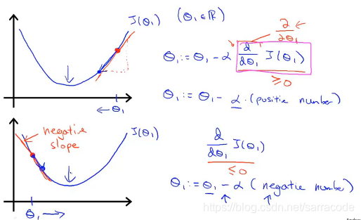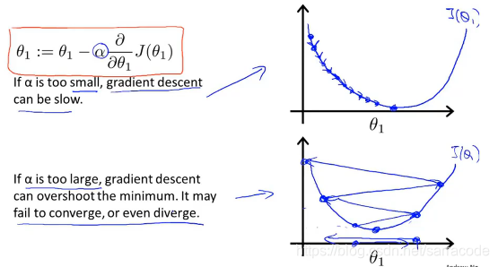 a称为学习率,用来控制梯度下降时,我们迈出多大的步子,如果a值很大,那么梯度下降就很迅速