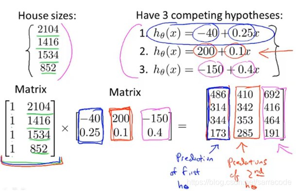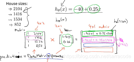 假设有四间房子,大小不同,需要计算每间房子h(x)的值,从而预测他们的价格,可以使用矩阵乘法计算