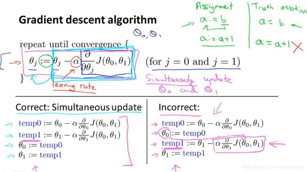其中左边的是正确的计算步骤;而右边的是错误的,因为没有做到同步更新,在计算temp1时使用了新的参数值0