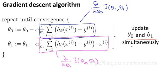 其中需要注意的是我们在使用梯度下降算法时要同时更新这两个参数0和