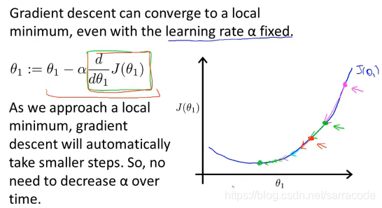 因为当我们接近局部最低点时,在局部最低时导数等于0,所以当我们接近最低点时,导数值会自动变得越来越小。