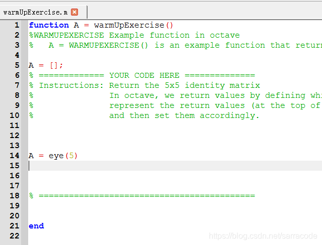 打开warmUpExercise.m这个函数,就是在YOUR CODE HERE 处添加代码即可