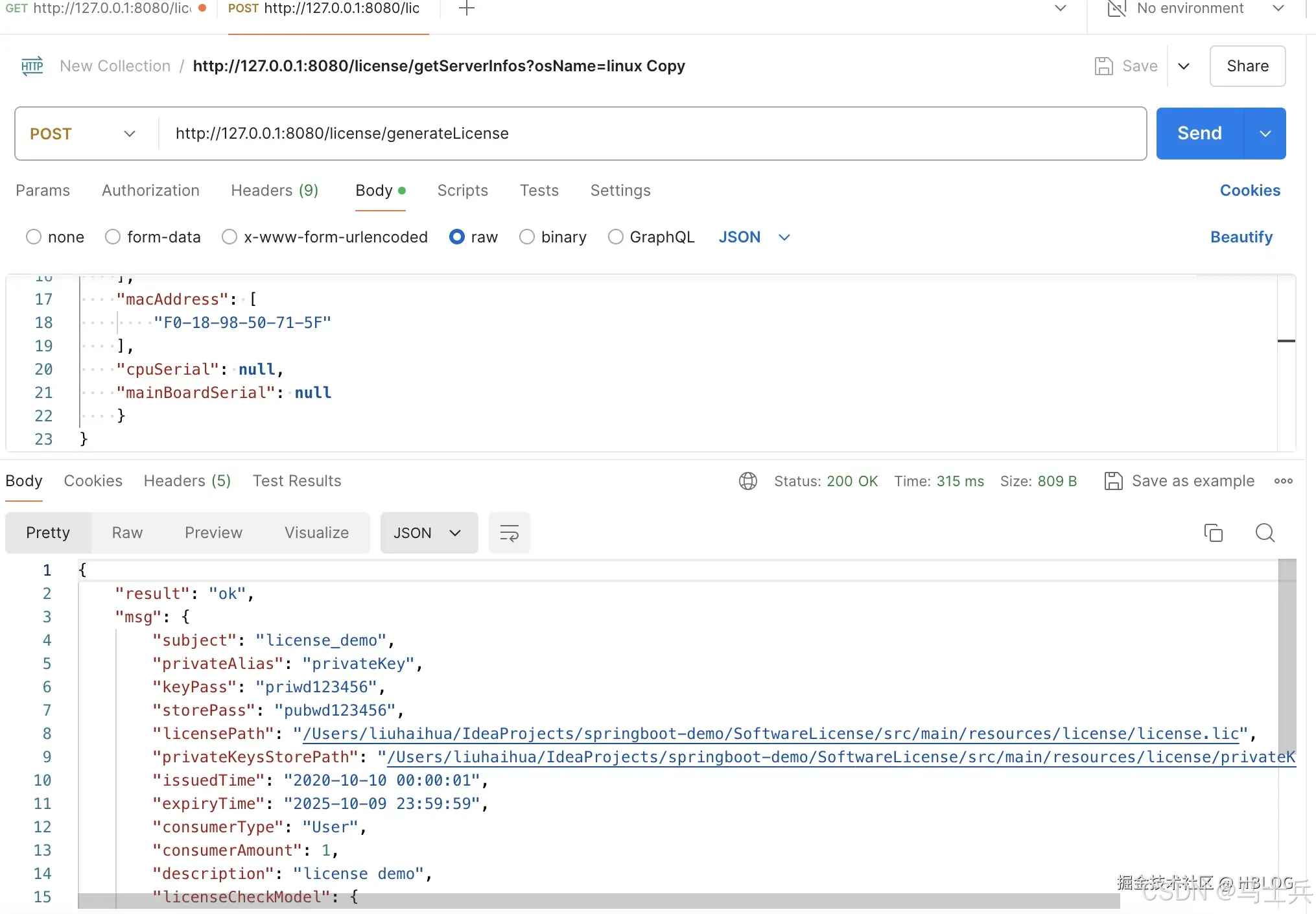 { "subject":"license_demo", "privateAlias":"privateKey", "keyPass":"priwd123456", "storePass":"pubwd123456", "licensePath":"/Users/liuhaihua/IdeaProjects/springboot-demo/SoftwareLicense/src/main/resources/license/license.lic", "privateKeysStorePath":"/Users/liuhaihua/IdeaProjects/springboot-demo/SoftwareLicense/src/main/resources/license/privateKeys.keystore", "issuedTime":"2020-10-10 00:00:01", "expiryTime":"2025-10-09 23:59:59", "consumerType":"User", "consumerAmount":1, "description":"license demo", "licenseCheckModel":{ "ipAddress": [ "192.168.0.100" ], "macAddress": [ "F0-18-98-50-71-5F" ], "cpuSerial": null, "mainBoardSerial": null } }