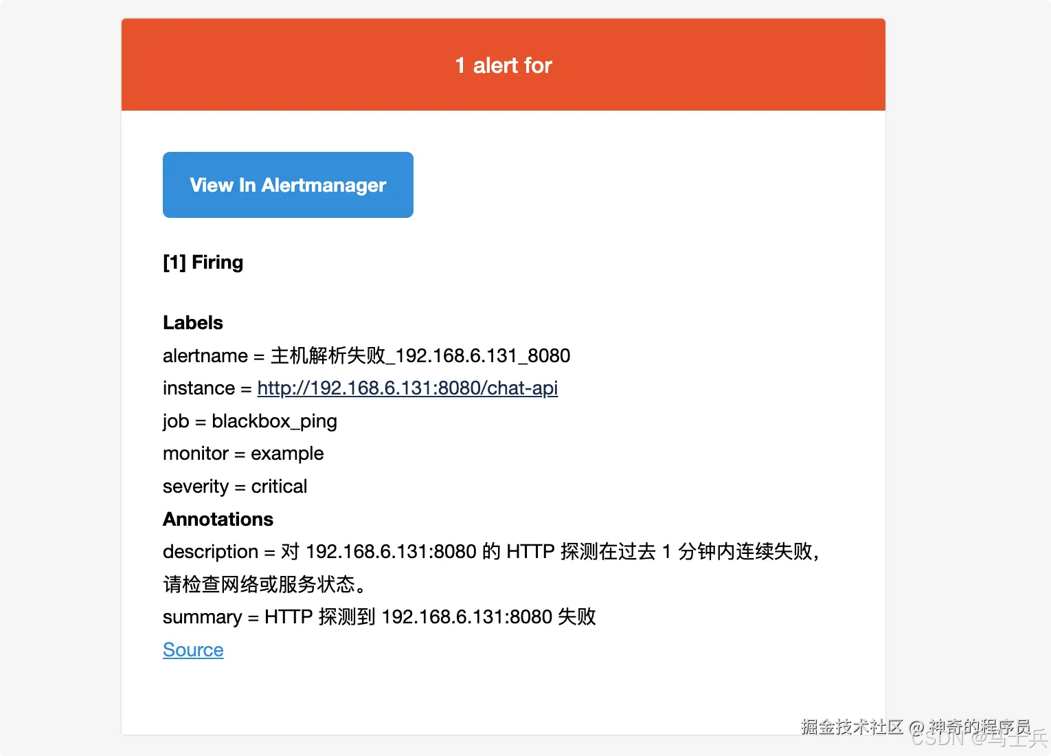 - alert: "主机解析失败_192.168.6.131_8080" expr: probe_success{instance="http://192.168.6.131:8080/chat-api",job="blackbox_ping"} == 0 for: 1m labels: severity: critical annotations: summary: "HTTP 探测到 192.168.6.131:8080 失败" description: "对 192.168.6.131:8080 的 HTTP 探测在过去 1 分钟内连续失败,请检查网络或服务状态。"