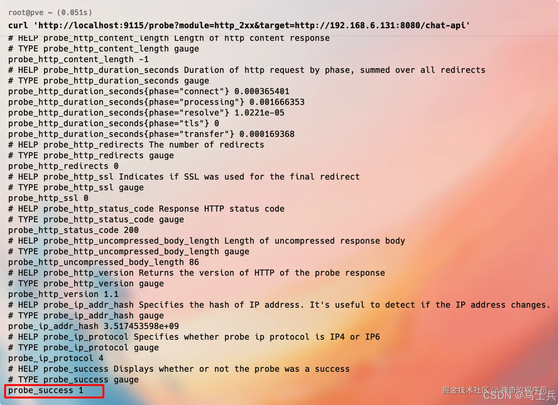 curl 'http://localhost:9115/probe?module=http_2xx&target=http://192.168.6.131:8080/chat-api'