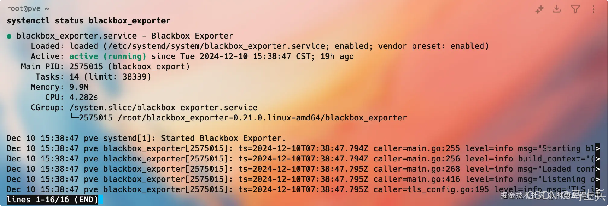 服务启动后,我们执行systemctl status blackbox_exporter命令,如果正常运行,你将看到如下所示的内容:
