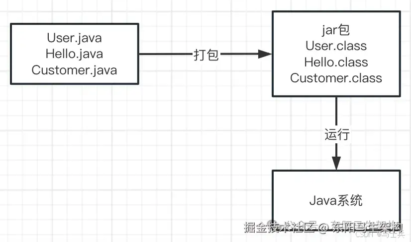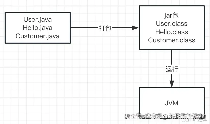 对写好的".java"代码进行打包的过程中,会把代码编译成以".class"为后缀的字节码文件,比如User.class。这些以".class"为后缀的字节码文件才是可以被JVM运行的。如下图示: