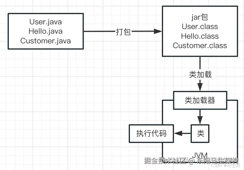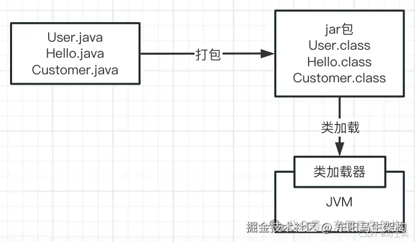 接着下一步,JVM要运行这些".class"字节码文件中的代码。首先会把这些".class"文件中包含的各种类加载到JVM里。这些".class"文件就是写好的一个个类,此时就会涉及一个叫"类加载器"的概念。也就是采用类加载器把编译好的".class"字节码文件给加载到JVM中,然后供后续代码使用,如下图示: