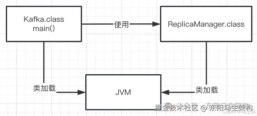 所以这时JVM就会通过类加载器从ReplicaManager.class字节码文件中,加载对应的ReplicaManager类到内存里使用,这样代码才能跑起来,如下图示: