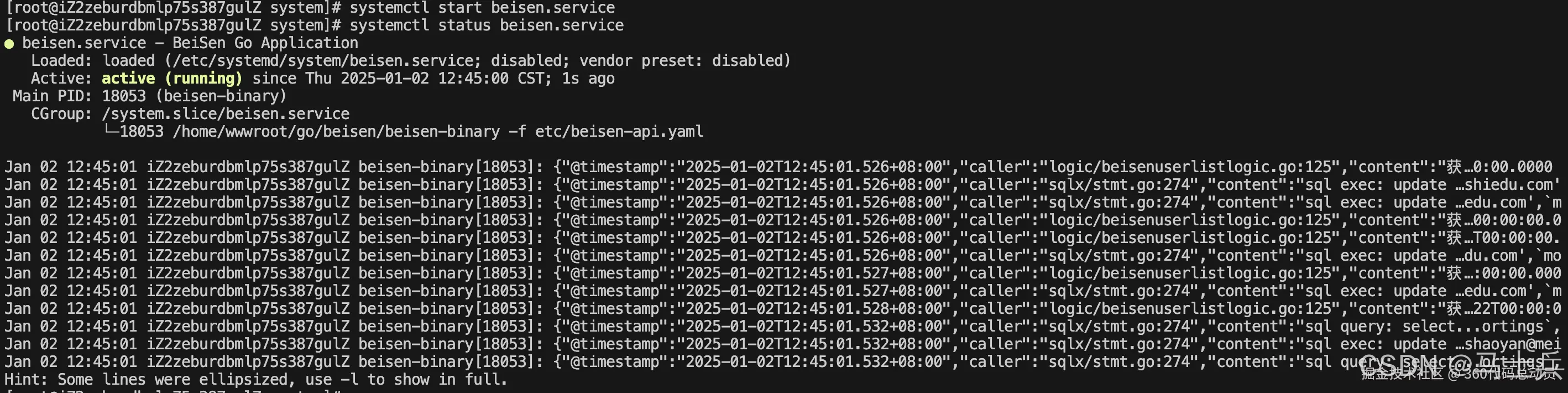 进程状态: Process: 17832 ExecStart=/home/wwwroot/go/beisen/beisen-binary -f etc/beisen-api.yaml (code=exited, status=203/EXEC) 服务启动时,尝试执行
