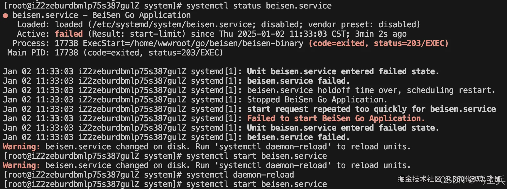 服务状态: Unit beisen.service entered failed state. 服务进入了“失败”状态,无法继续运行。