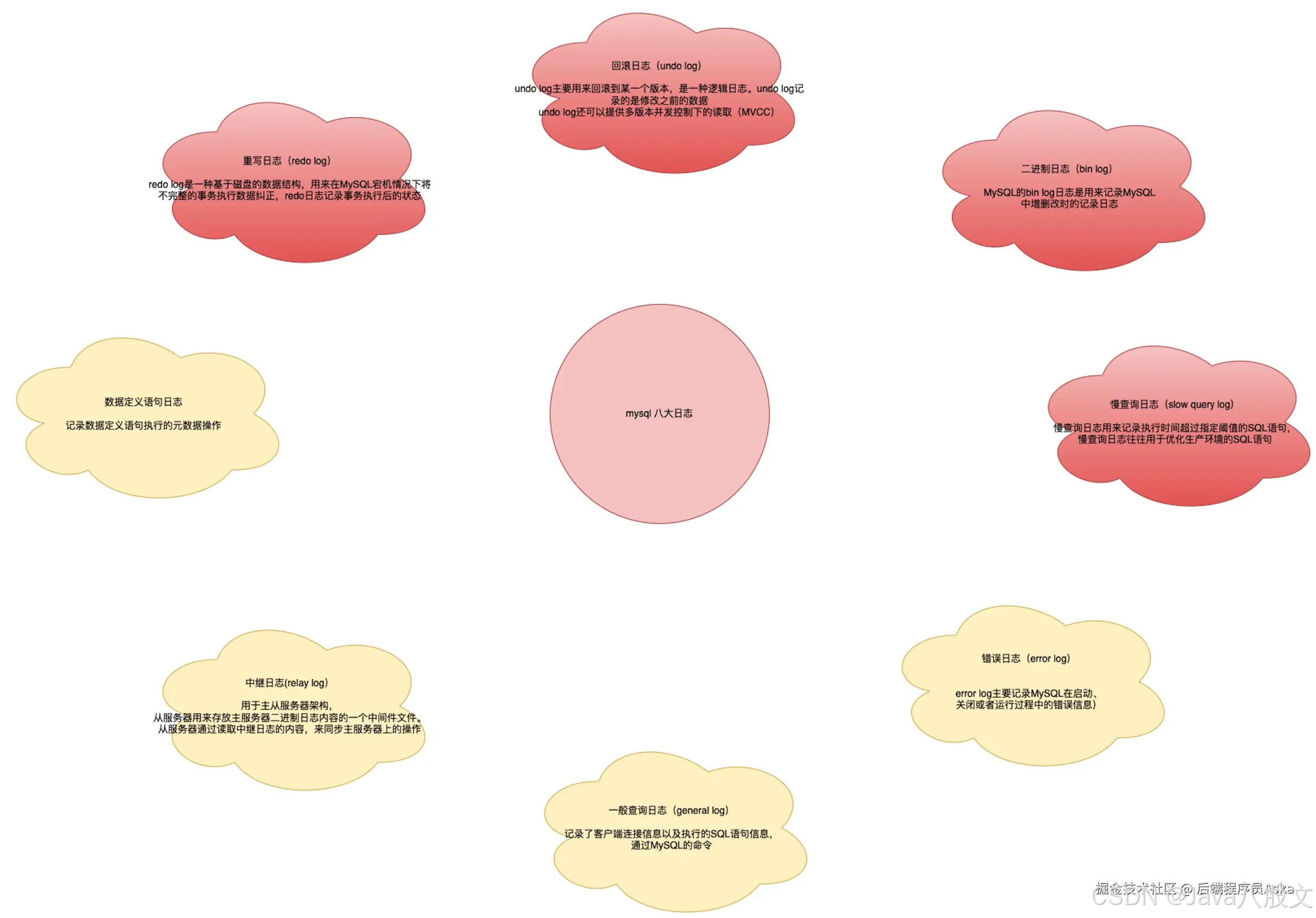 MySQL中存在着以下几种日志:重写日志(redo log)、回滚日志(undo log)、二进制日志(bin log)、错误日志(error log)、慢查询日志(slow query log)、一般查询日志(general log)、中继日志(relay log)、数据定义语句日志
