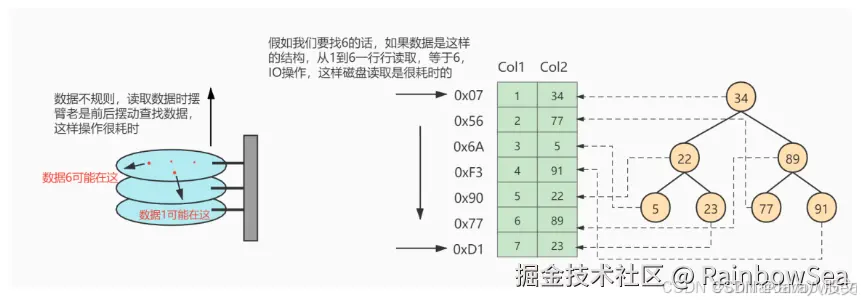 如上图所示,数据库没有索引的情况下,数据分布在硬盘不同的位置上面,读取数据时,摆臂需要前后摆动查询数据,这样操作非常消耗时间。如果数据顺序摆放,那么也需要从1到6行按顺序读取,这样就相当于进行了6次IO操作,依旧非常耗时。如果我们不借助任何索引结构帮助我们快速定位数据的话,我们查找 Col 2 = 89 这条记录,就要逐行去查找、去比较。从Col 2 = 34 开始,进行比较,发现不是,继续下一行。我们当前的表只有不到10行数据,但如果表很大的话,有上千万条数据,就意味着要做很多很多次硬盘I/0才能找到。现在要查找 Col 2 = 89 这条记录。CPU必须先去磁盘查找这条记录,找到之后加载到内存,再对数据进行处理。这个过程最耗时间就是磁盘I/O(涉及到磁盘的旋转时间(速度较快),磁头的寻道时间(速度慢、费时))