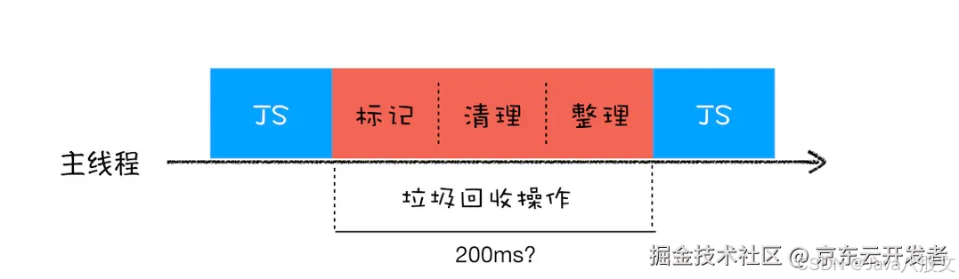 如果在执行垃圾回收的过程中,占用主线程时间过久,就像上面图片展示的那样,花费了 200 毫秒,在这 200 毫秒内,主线程是不能做其他事情的。比如页面正在执行一个 JavaScript 动画,因为垃圾回收器在工作,就会导致这个动画在这 200 毫秒内无法执行的,这将会造成页面的卡顿现象。