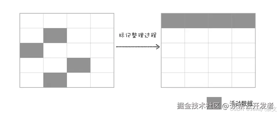 这个标记过程仍然与标记 - 清除算法里的是一样的,但后续步骤不是直接对可回收对象进行清理,而是让所有存活的对象都向一端移动,然后直接清理掉端边界以外的内存。V8 研究团队 2016 年的一篇博文:在一次完整的垃圾回收之后,V8 的堆增长策略会根据活动对象的数量外加一些余量来确定何时再进行垃圾回收。