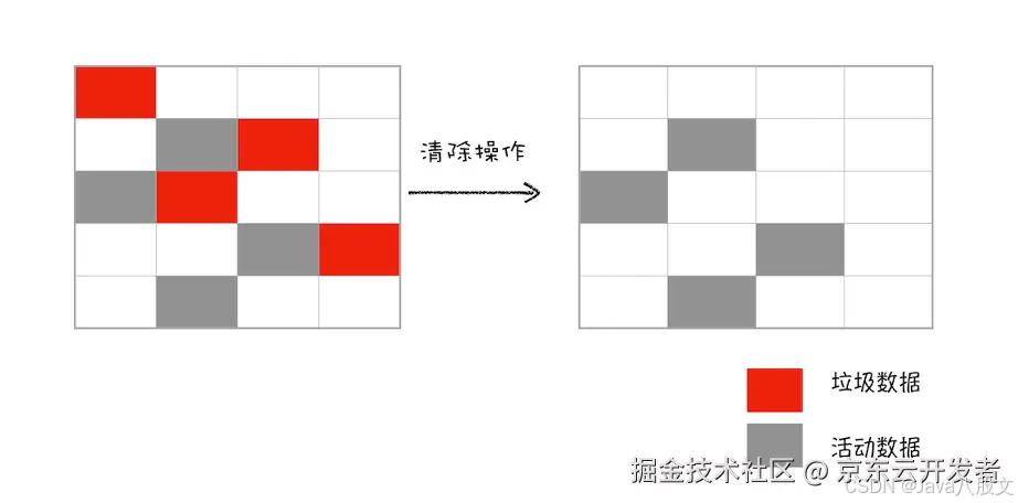 标记-清除:首先是标记过程阶段。标记阶段就是从一组根元素开始,递归遍历调用栈,在这个遍历过程中,能到达的元素称为活动对象,没有到达的元素就可以判断为垃圾数据。标记过程和清除过程就是标记 - 清除算法 Mark-Sweep ,不过对一块内存多次执行标记 - 清除算法后,会产生大量不连续的内存碎片。