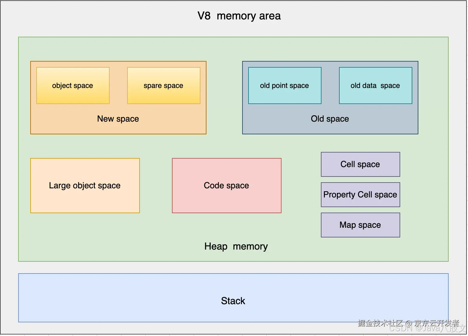 - 代码空间:专门用于存储 JIT(Just-In-Time)编译生成的机器代码。代码空间与其他空间分离,因为代码的生命周期通常较长,且需要高效访问。